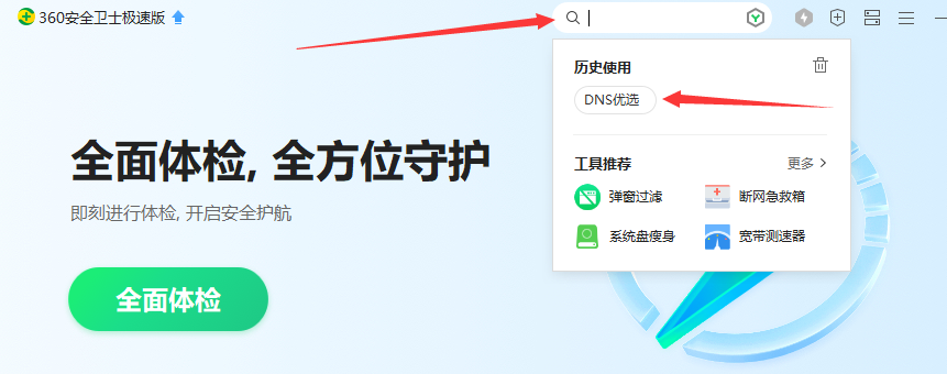 360安全卫士的功能搜索框搜索“DNS优选”,然后“开始DNS优选”,最后选择“立即启用”即可去除DNS劫持