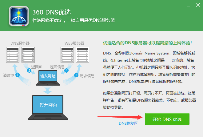 DNS被劫持可以百度一下手动修改DNS服务器,也可以使用360安全卫士集成的“DNS优选”